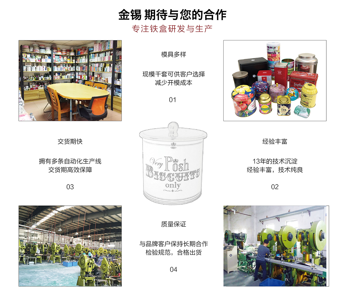 廣州市金錫五金制品有限公司成立于2016年,是已有13年生產(chǎn)經(jīng)驗的實力廠家。我廠是專業(yè)定制優(yōu)良馬口鐵盒、鐵罐、禮品盒、茶葉罐、月餅盒等金屬鐵盒包裝的制罐企業(yè),我們擁有超過6000平方米的標準現(xiàn)代化廠房及八條生產(chǎn)線。公司集產(chǎn)品研發(fā)、設(shè)計、生產(chǎn)、銷售于一體,技術(shù)優(yōu)良,實力雄厚。通過十多年的制罐經(jīng)驗,我們擁有專業(yè)的技術(shù)團隊,嚴格的作業(yè)流程、完整的品質(zhì)保障體系、完善的銷售以及售后服務(wù)系統(tǒng)。